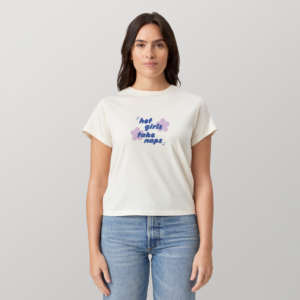 Because hot girls know that you never have to earn rest. Dreamy bubble letters in soft cloud tones spell out "Hot Girls Take Naps" for peak nap-core energy. Throw it on post-yoga, pre-brunch, or mid–scroll spiral. You deserve this nap.