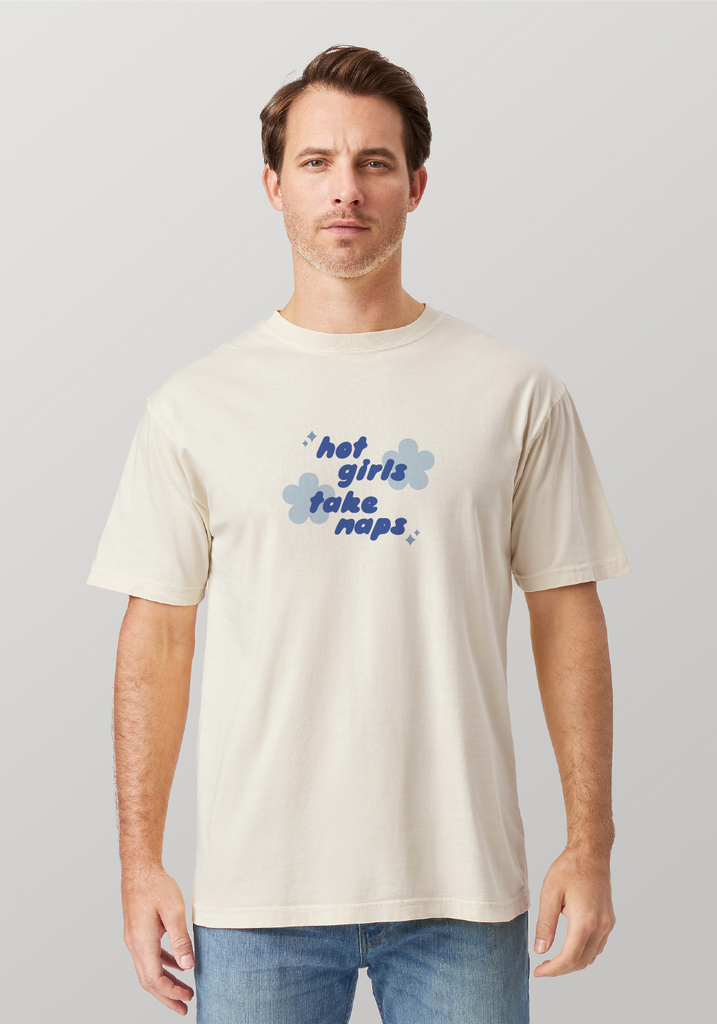 Because hot girls know that you never have to earn rest. Dreamy bubble letters in soft cloud tones spell out "Hot Girls Take Naps" for peak nap-core energy. Throw it on post-yoga, pre-brunch, or mid–scroll spiral. You deserve this nap.